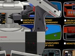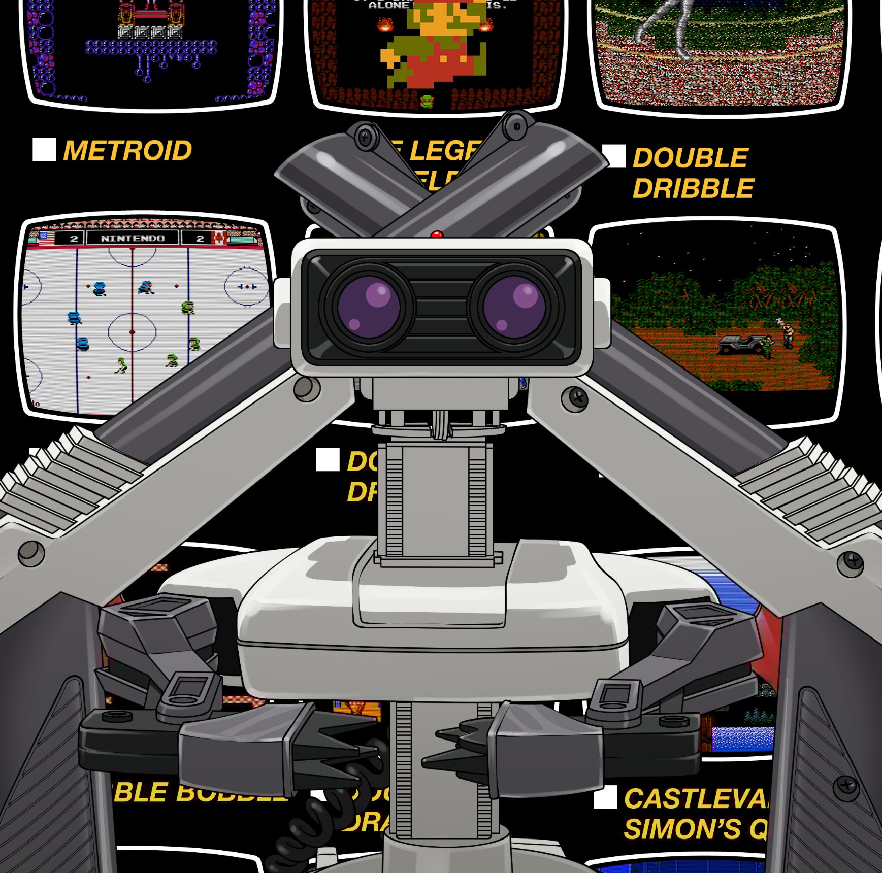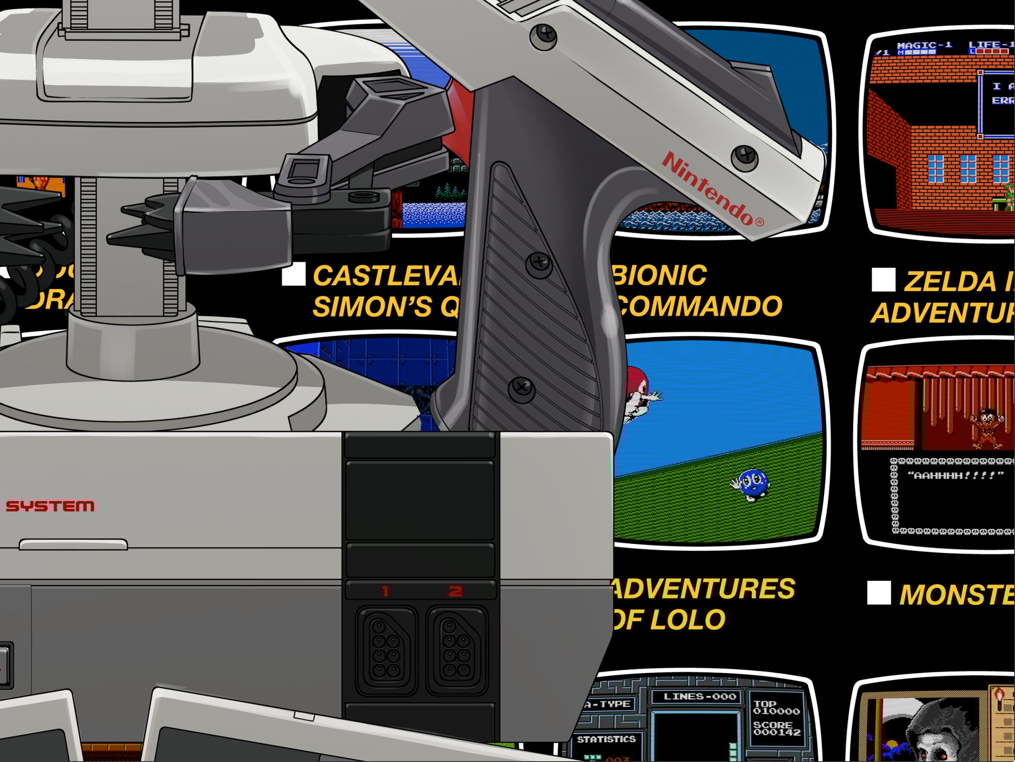R.O.B. the Robot, an NES console and accessories set against a background of gameplay screens from the top NES games, presented in roughly chronological order.