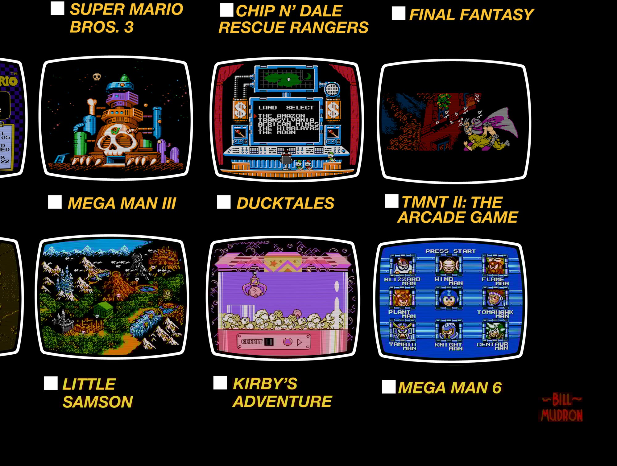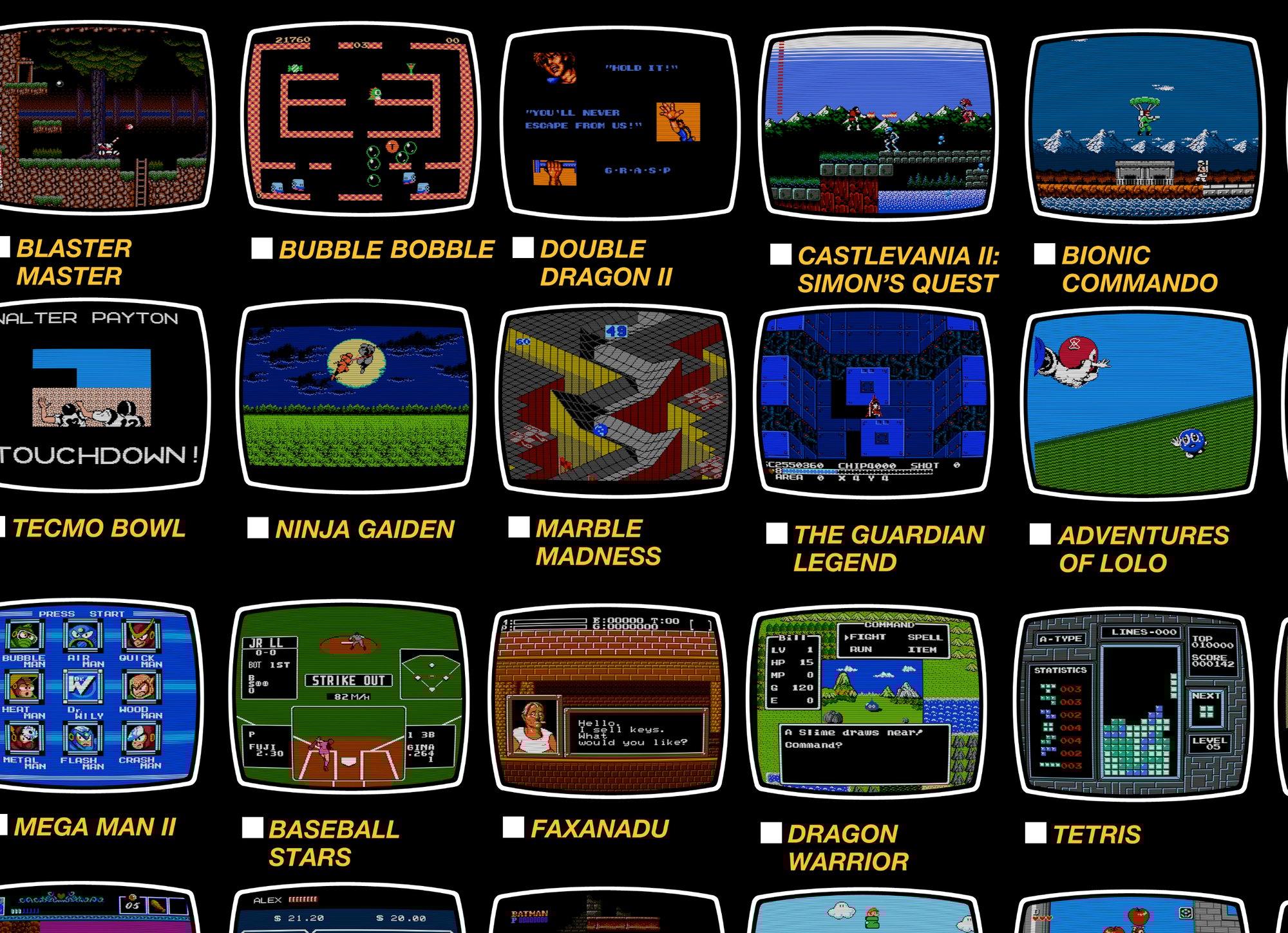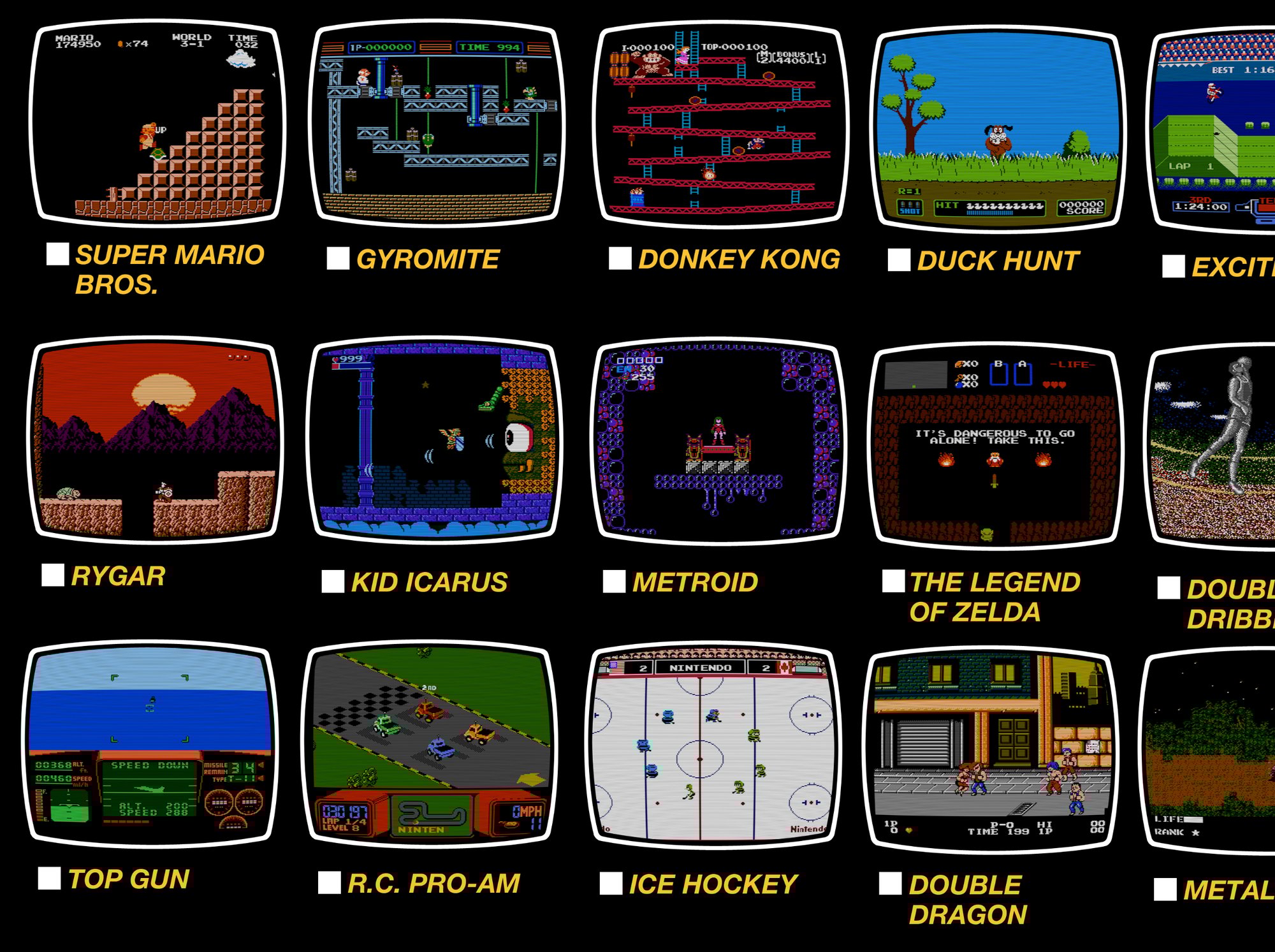 A tribute to the Game Pak checklist posters that were packed in with every NES console back in the day: gameplay screens from the top NES games, presented in roughly chronological order.