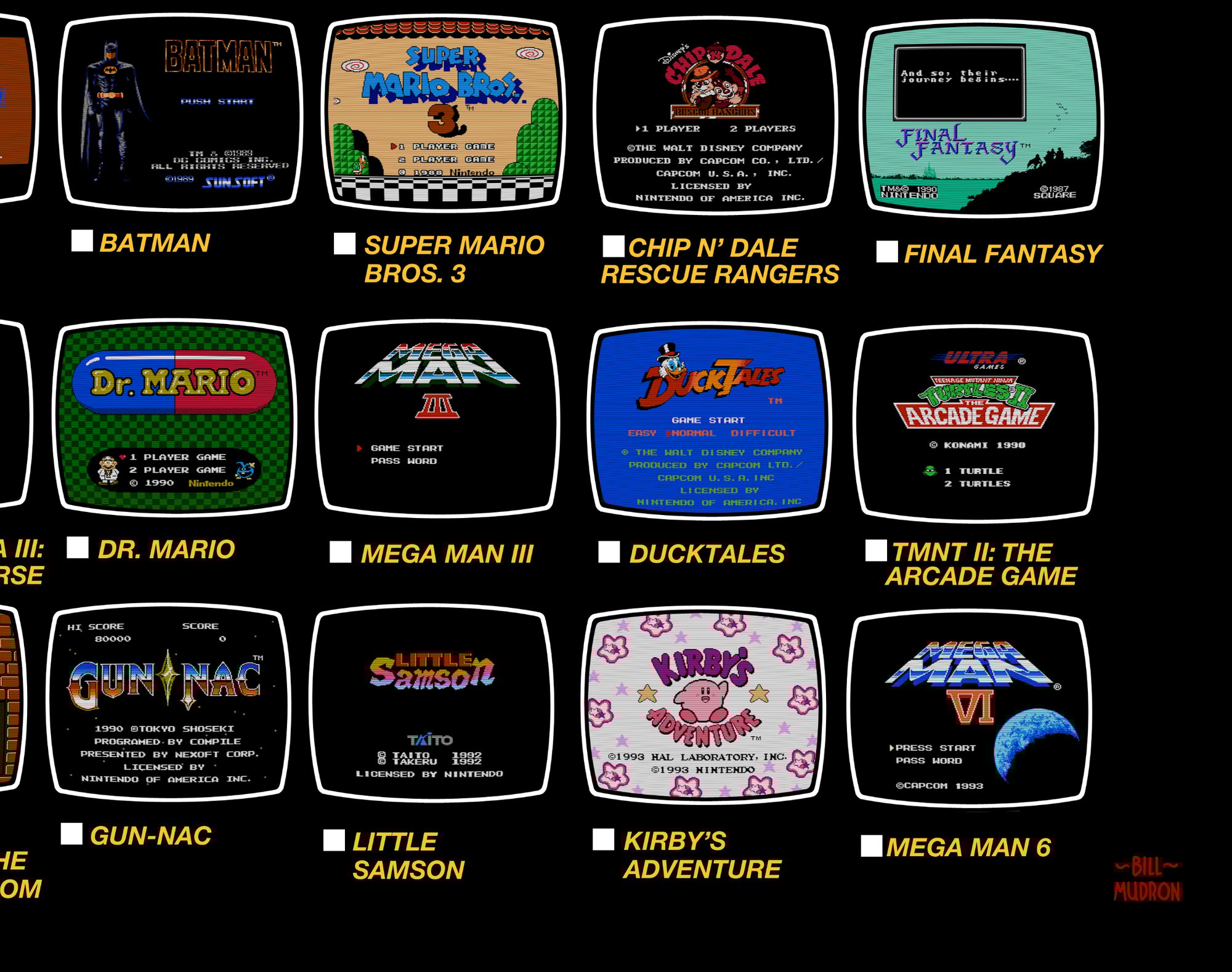 A tribute to the Game Pak checklist posters that were packed in with every NES console back in the day: title screens from the top NES games, presented in roughly chronological order.